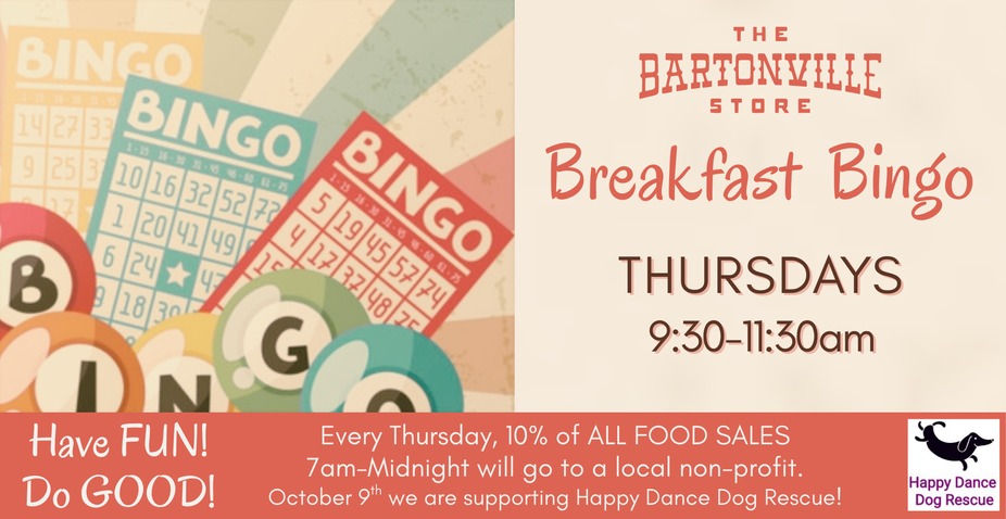 Grab your friends and family and join us for the best BINGO & BREAKFAST in Bartonville! Every Friday we will gather as a community to have fun while supporting local non-profits with a portion of food sales from the day. Last year we raised money for some amazing organizations in our local area, and we can't wait to do even more good in 2026! The bingo & coffee are free ~ no purchase necessary. Join us for some fun on Fridays at "The Store"! Who will be our special non-profit guest this week? You'll have to come on down and see! Reservations recommended, but not required. https://www.exploretock.com/thebartonvillestore/ We open for breakfast at 8am, Bingo starts at 9:30. *if you would like to suggest a local non-profit for one of our Fridays, please email us at thebartonvillestore@gmail.com09:30 AM - 11:00 PM